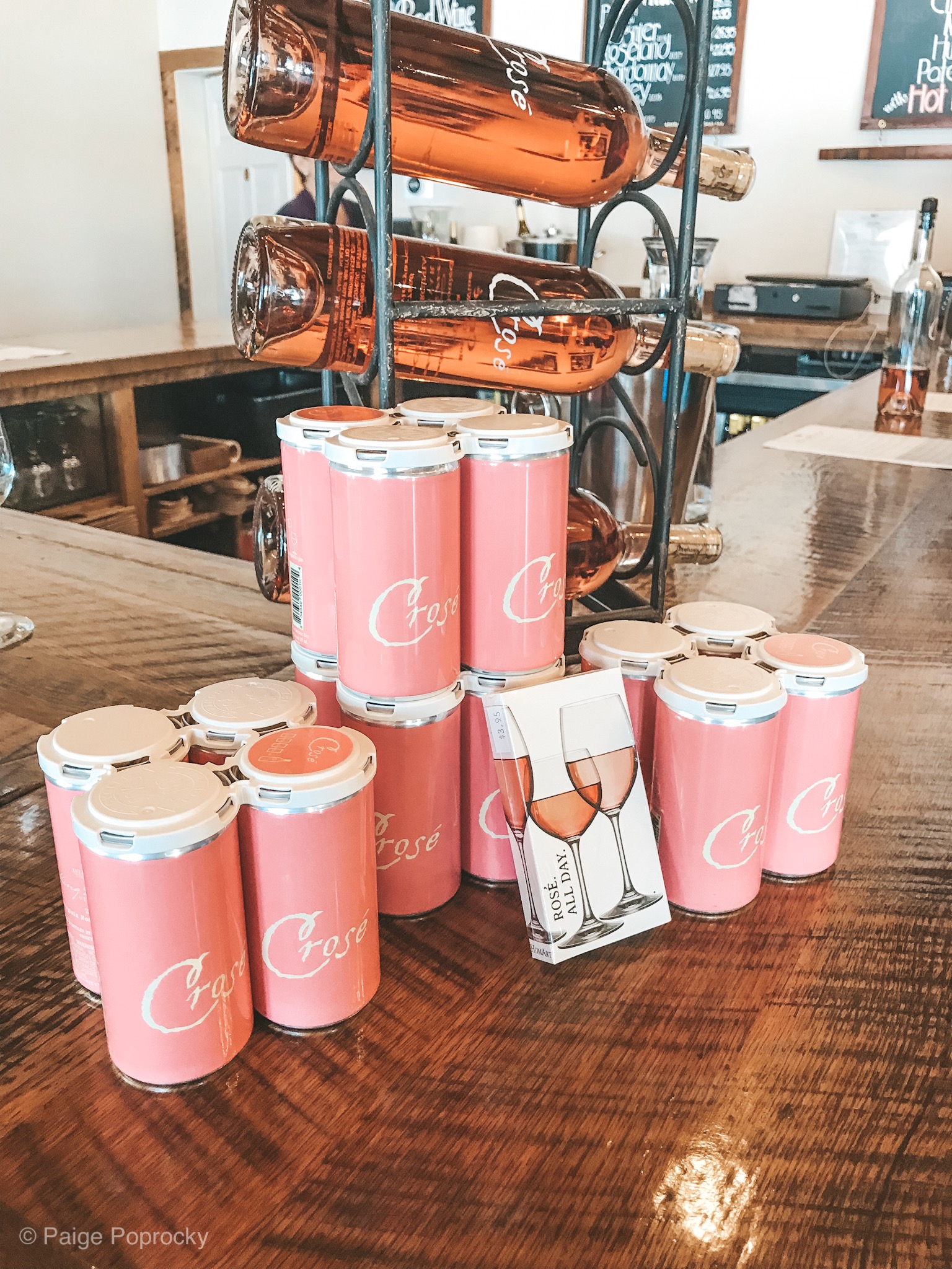 King Family Vineyards – King Family is wonderful and has expanded quite a bit since we started visiting. I was happy to learn a lot from my tasting at King Family. When our attendant poured their Viognier, she stated that it was aged in a combination of stainless steel, neutral French oak, acacia, and concrete. I knew that concrete was a thing but I had only had concrete aged wines from Stinson Vineyards. I asked if she could tell me more about concrete and she obliged. The concrete eggs are heavy and have very thick walls that are porous. The tiny pockets trap air and allow the wine limited contact with oxygen. Like stainless steel, concrete doesn’t impart any additional flavor. Concrete often gives more texture to the wine with great minerality. I generally do not like oak aged whites but I did enjoy their Viognier since it was more complex with all the different combinations. My all time favorite wine at King Family is their Crose Rose. It is light, fruity and refreshing. They even have it in CANS, OMG! They are the same cost as a bottle and four cans equal one bottle. We enjoyed a bottle of Crose along with cheese and a warm baguette. They sell snacks if you did not bring your own picnic π