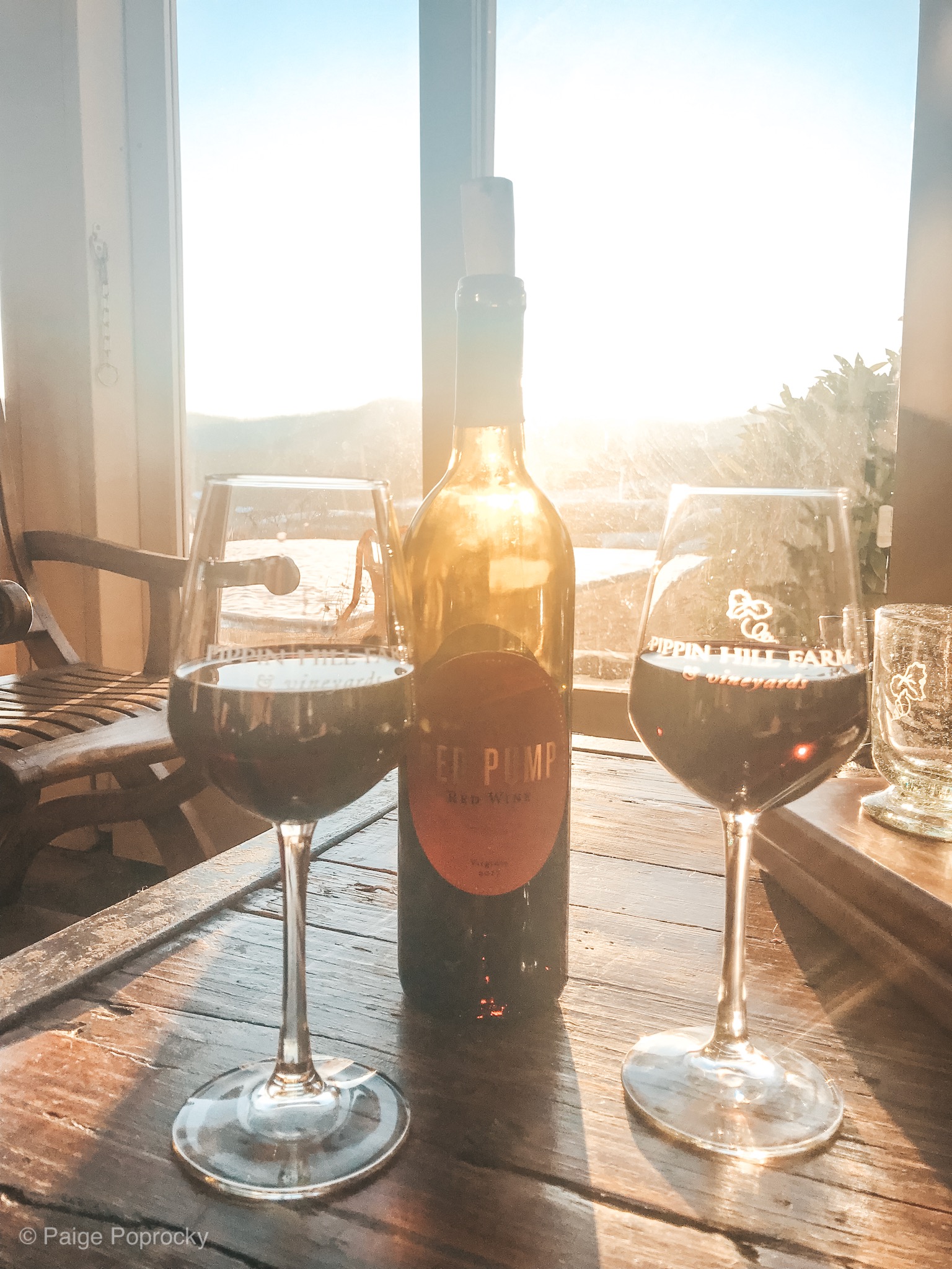 Pipping Hill Farm and Vineyards – Pippin Hill is a super popular spot. If you are going on the weekend, plan to arrive right when they open! The view and atmosphere of this place are amazing; you want to stay for hours. Pippin does have a small tasting bar where you can do traditional tastings and flights, tastings cost between $10-12 depending on what you get. The other option is getting a table, this is more a restaurant style of winery. You get a server where you can order food, a bottle or glass of wine. We had a lovely time when we went this past winter. We had an amazing, intimate tasting at the bar then hung out in their winterized porch with a bottle of their Red Pump and enjoyed a spectacular sunset over the mountains. In the summer, everything is open and beautiful. They have a lovely view and beautiful gardens. The food is prepared farm to table style. They have their own herb and vegetable gardens, chickens, and they source locally. In the past, we have ordered food and it was fresh and delicious. We have several favorites at Pippin. We love their Red Pump, Cabernet Franc, and both their Sparkling Wines.