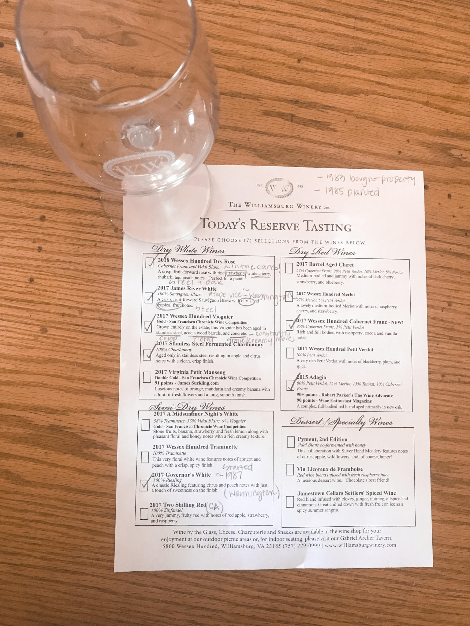 Williamsburg Winery – As a 4th grade teacher who teaches Virginia Studies, I swoon when I am in Williamsburg. There is so much history and I love how Jamestown is so close! This winery was bought in 1983 and the first vines were planted in 1985. The property is 300 acres with 40 acres of vines. There are many options when it comes to tours and tastings. Their website lays out all of your options if you would like to do a tour of their facilities. We have not done a tour but I hope to do one soon! They offer two tastings, the Fine Wine tasting is $10 and the Reserve tasting is $15. Both options include 7 wines that you get to pick as well as a wine glass.
