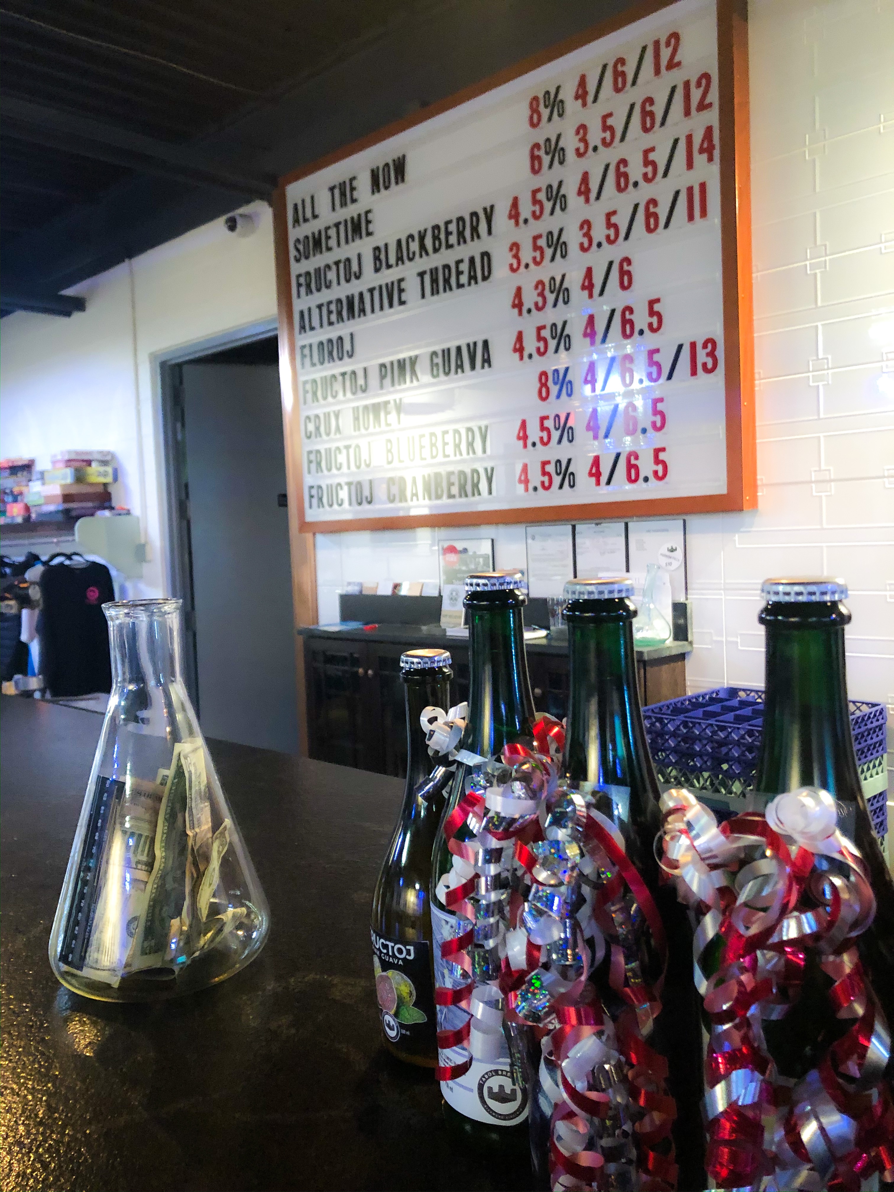 They change up their offerings, but during my visit there were two that were a hit with me and of course my friends all had their faves as well! My pick was the Fructjo Cranberry which is their Tabol Biere aged on cranberries, it was perfectly tart and light. I was also a fan of their Fructjo blackberry.. (see the trend for me?). The guys loves the All The Now and the Sometime, both are variations of an IPA! We brought a couple board games and hung out for a couple hours 10/10 in our group would recommend!