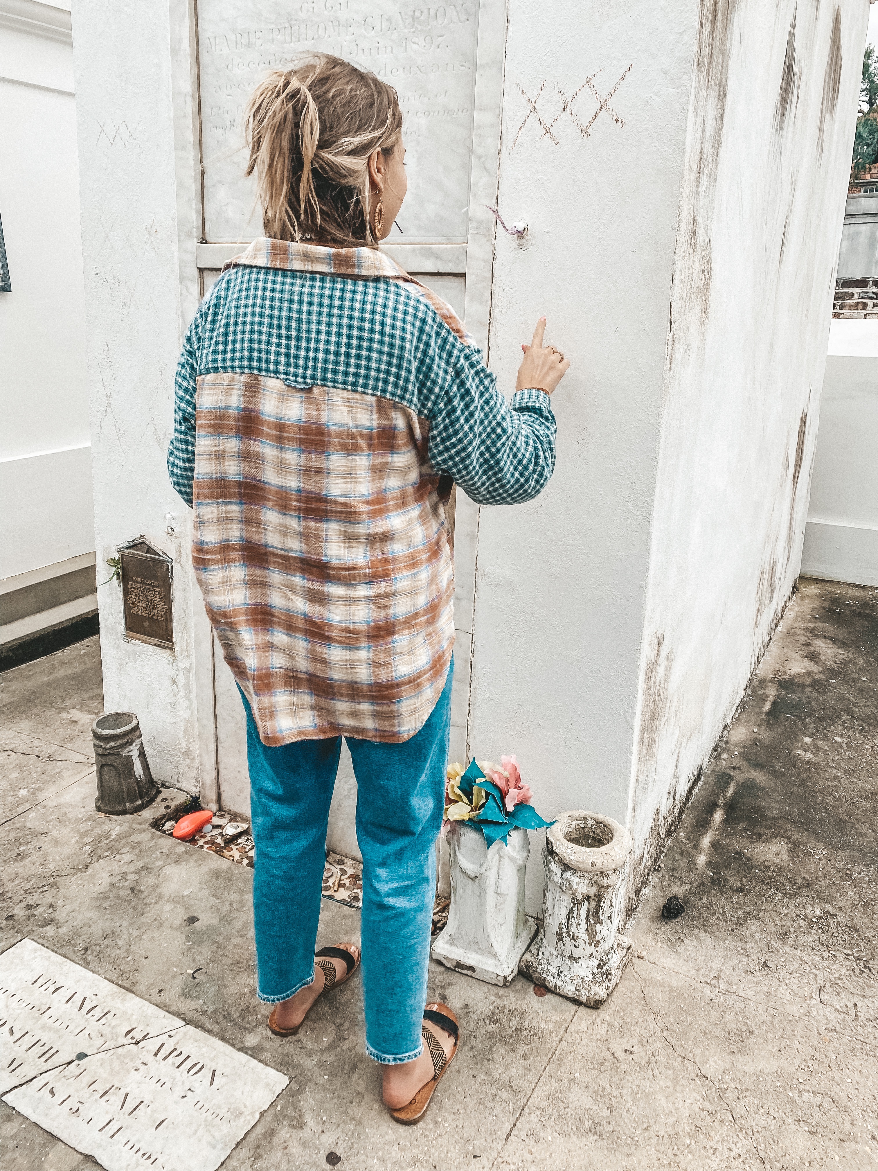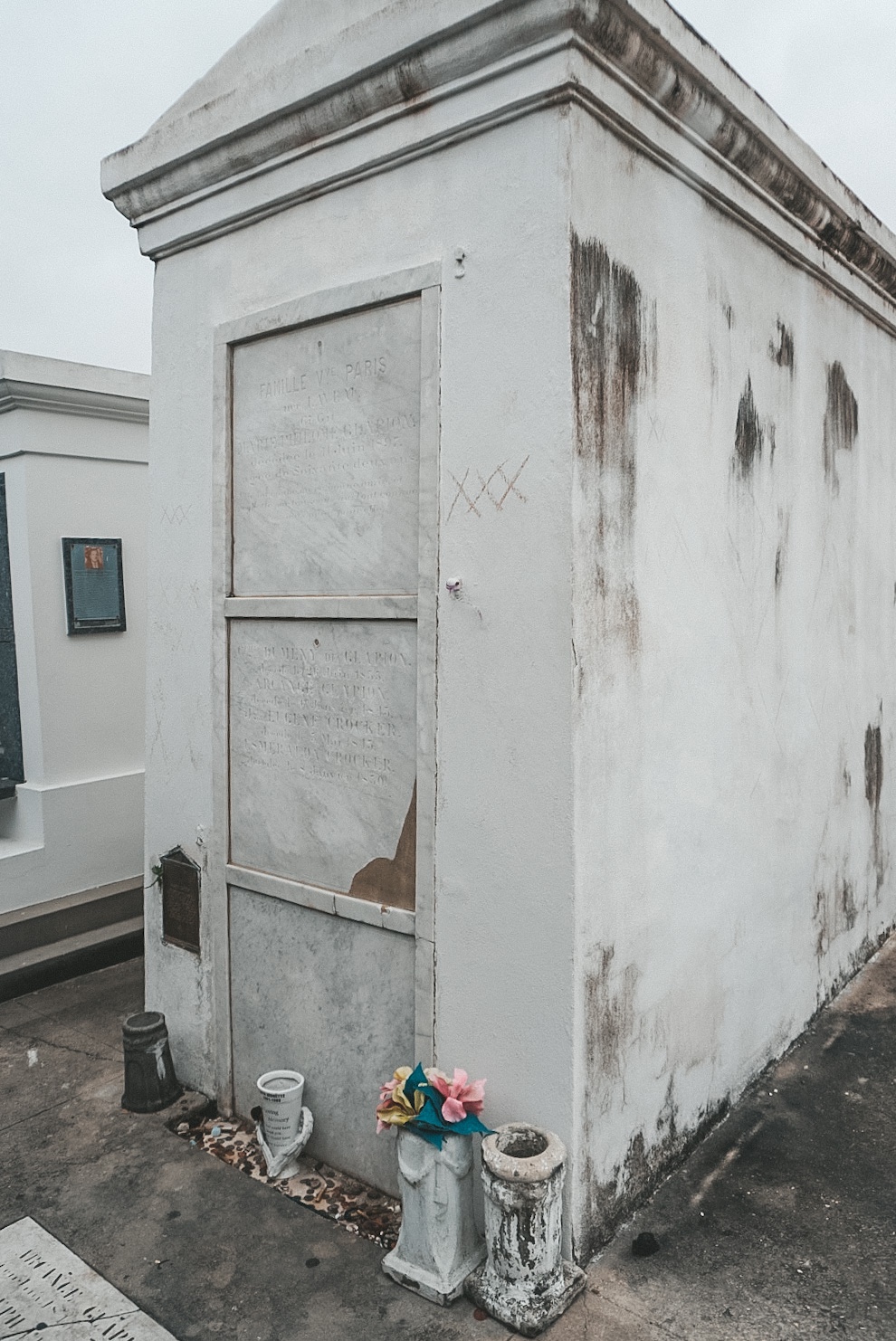 Unlike most other New Orleans cemeteries, St. Louis Cemetery No. 1 is accessible only via guided, licensed tours. That’s because the cemetery has been subject to vandalism over the years. A little bit of history: The city’s high water makes in-ground burials impossible so a coffin buried underground would simply float back up to the top. That is why they use “oven faults” or “wall faults” to bury the dead. Many oven vaults house the remains of countless family members. After a body is interred, it is left undisturbed in the grave for a period of one year and one day. At that point, the remains may be pushed to the back of the tomb, leaving room for another body to be interred. Of course I was eager to see the resting site of Voodoo Queen Marie Laveau, I even left an offering!